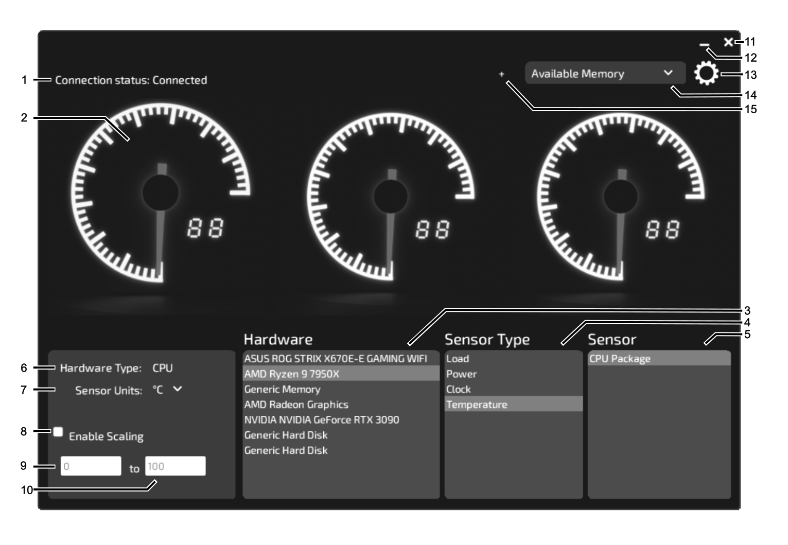 Many sensor values such as temperatures and percentages fall between 0 and 100, but some sensor values — like clock speed or fan RPM — can exceed the gauge’s default range of 0 to 100. You can customize the scale to match the data you're monitoring, which is helpful when monitoring hardware metrics that have a wide range or when focusing on a specific performance window.